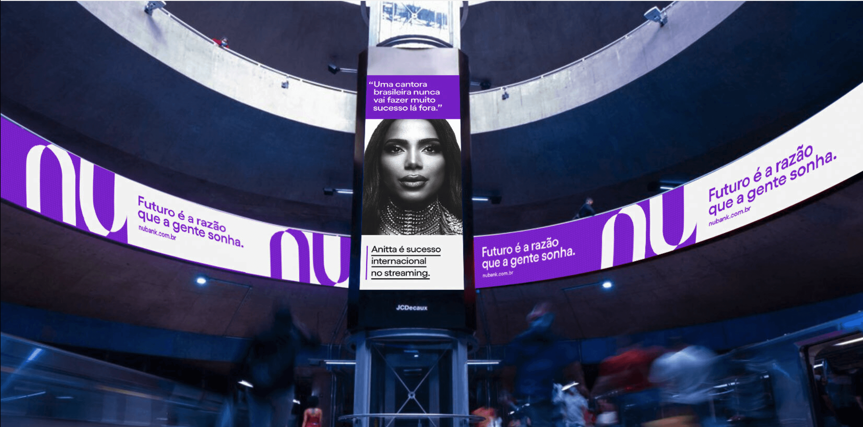 Nubank's first national mass media campaign: a TV spot broadcast across major prime-time networks, complemented by OOH and digital. The film featured Anitta — one of Brazil's most iconic and internationally recognized artists — photographed by a renowned American photographer. The visual language was deliberately bold: black and white in prime-time television, a format almost unheard of in Brazilian advertising. A statement in itself — proving that Nubank could communicate differently, even in the most traditional media environment.
